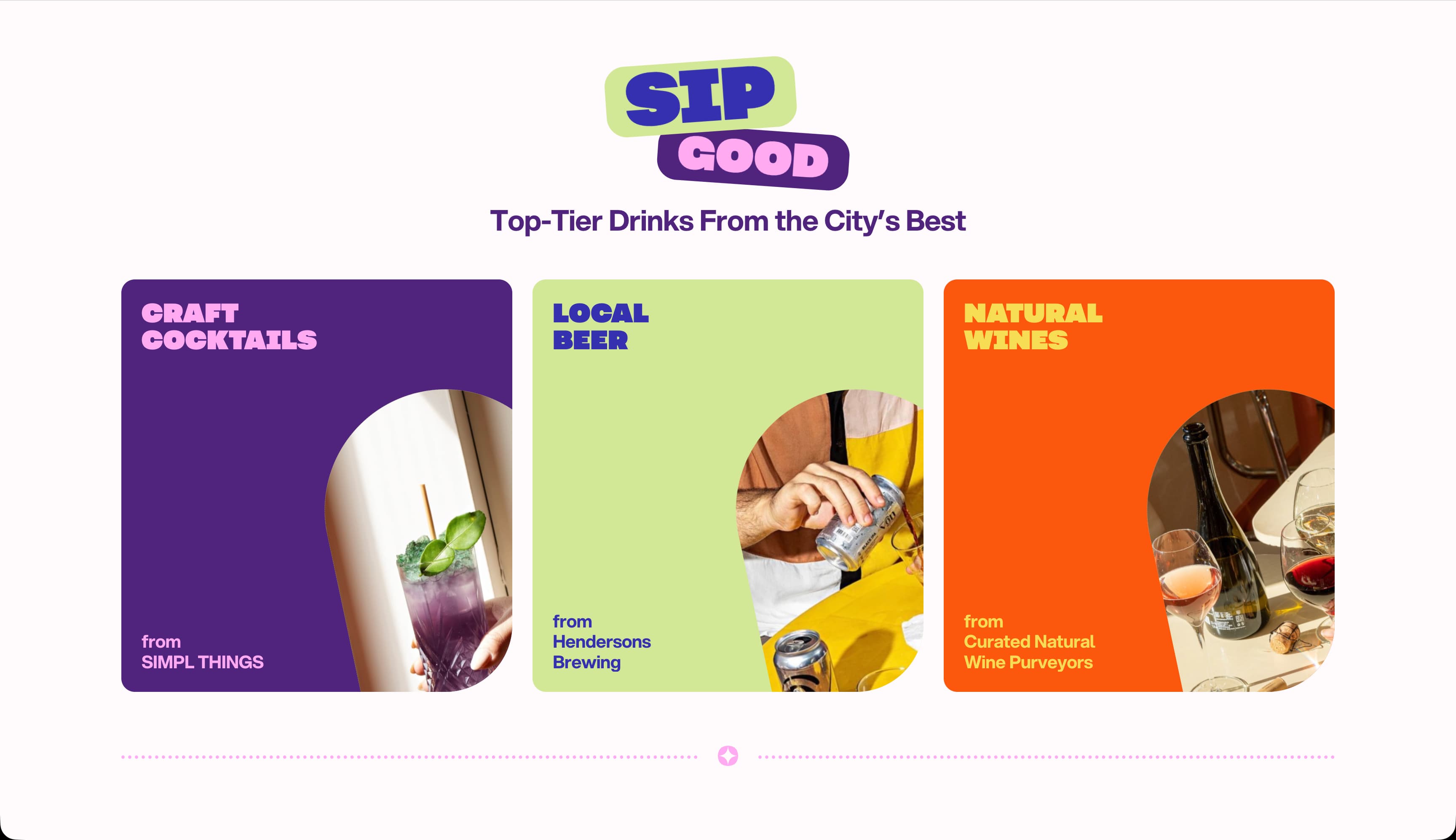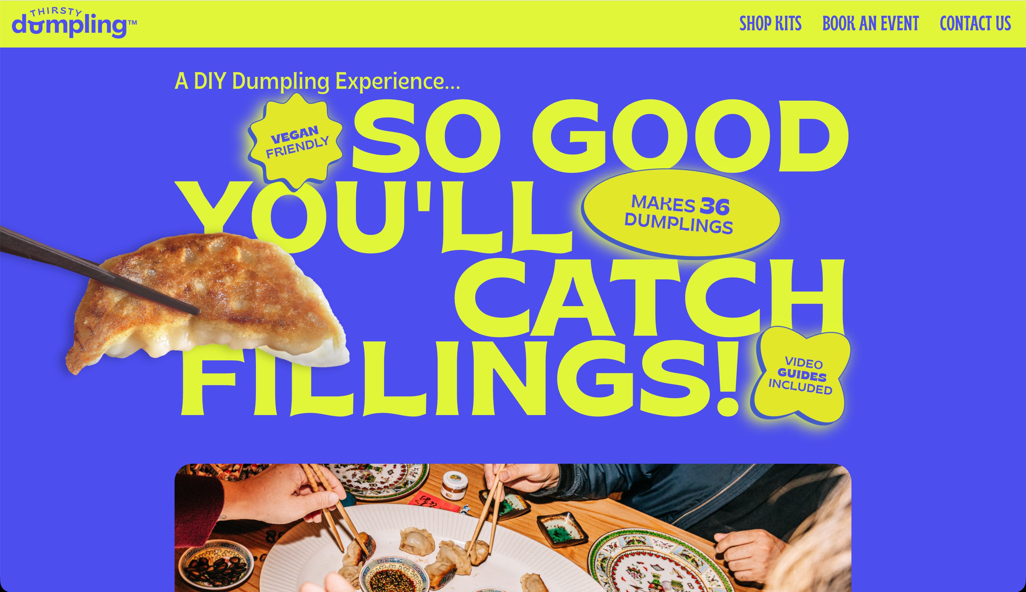 In contrast to the Watermelon palette, Thirsty Dumpling’s two-toned complementary combination is loyal to its primary shades with little variation: a neon green and a blue that feels distinctly digital. While neon green and bright blue are a pair that seem synonymous with the early internet (think: early RGB colorspace), when applied to a food brand, it feels modern and eye-catching.