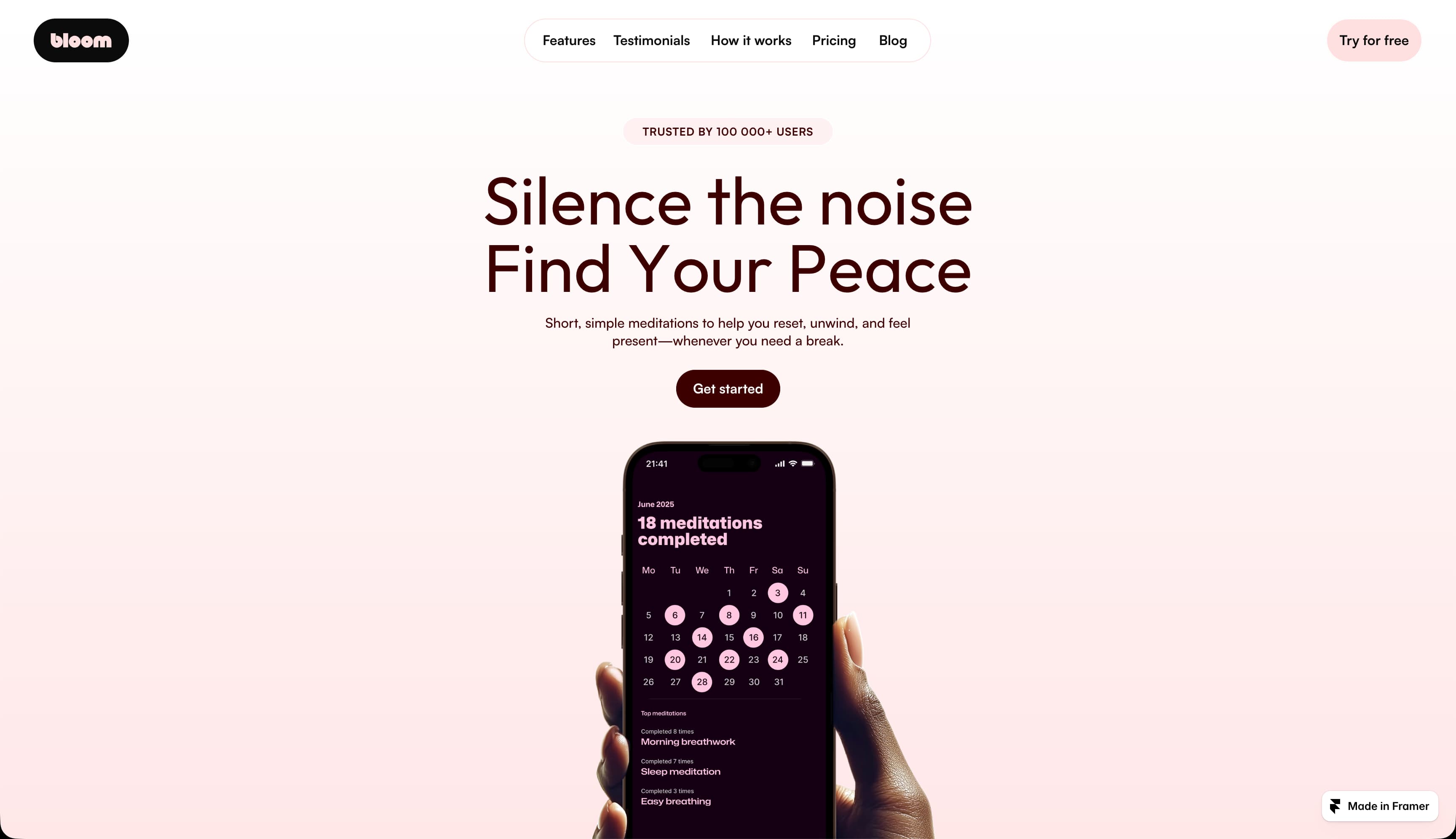 One color contains the multitudes to create an entire palette. In the Bloom Framer template, pink runs the gamut from a deep rose to a light pastel shade, providing a contemplative mood and sufficient contrast for excellent legibility.