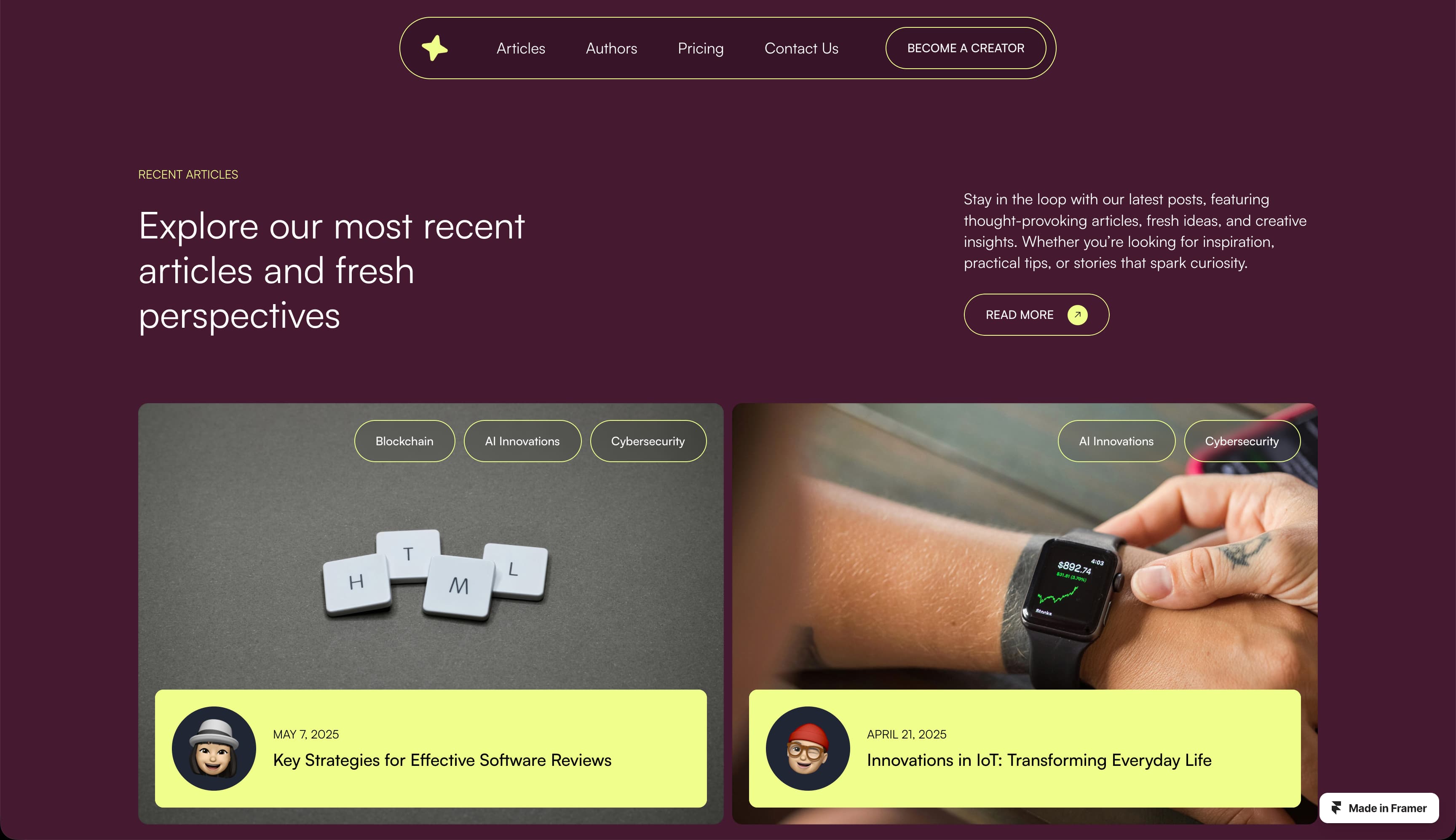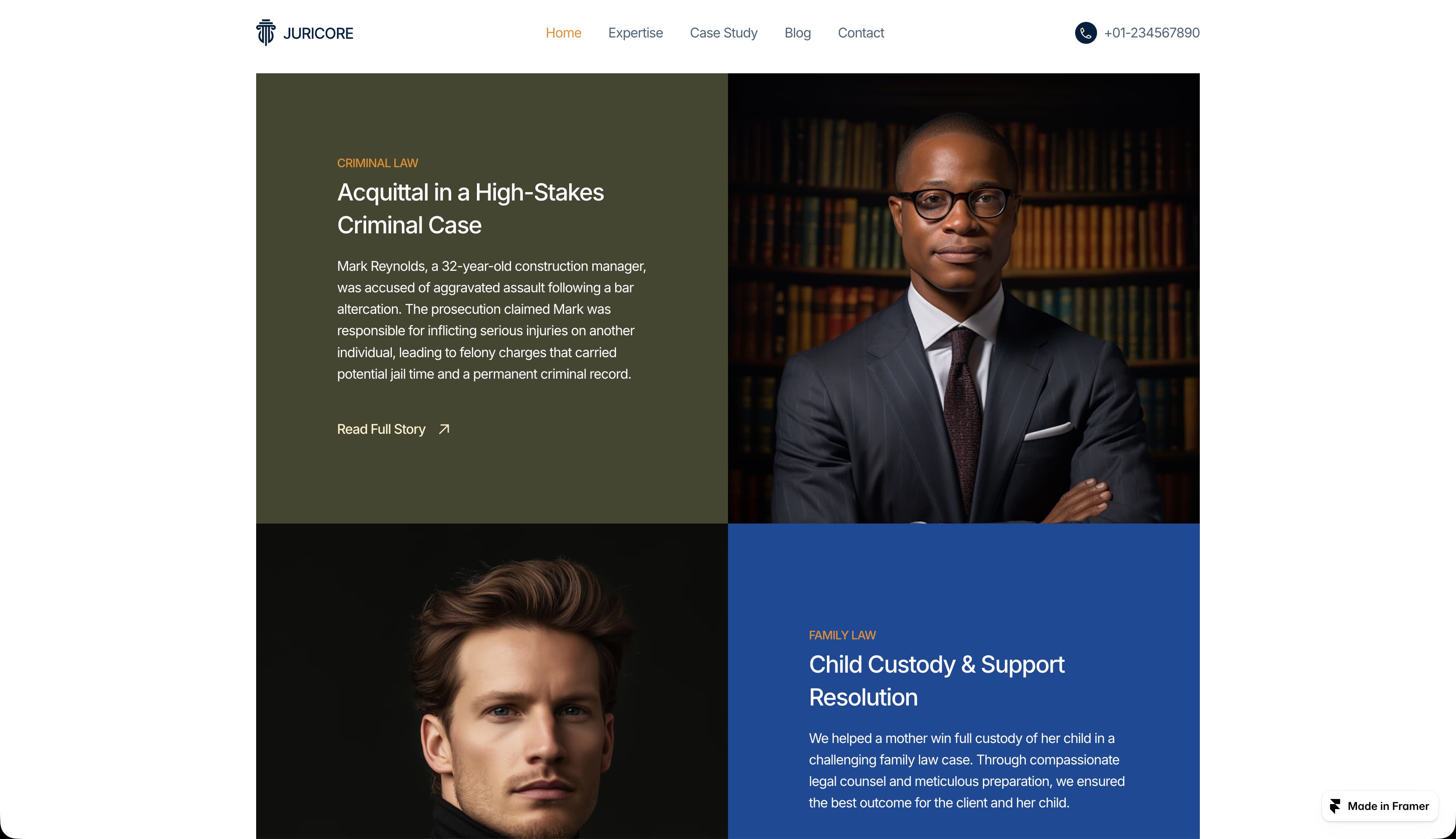 Perhaps one of the simplest ways to please the eye is to draw up an analogous color palette. In the Charis Framer template, warm browns sit nicely with a creamy mustard yellow. The harmony draws the eye in, and the contrasting values—a deep brown against a lighter yellow—ensure the warm tones blend when you want them to and pop when you don’t.