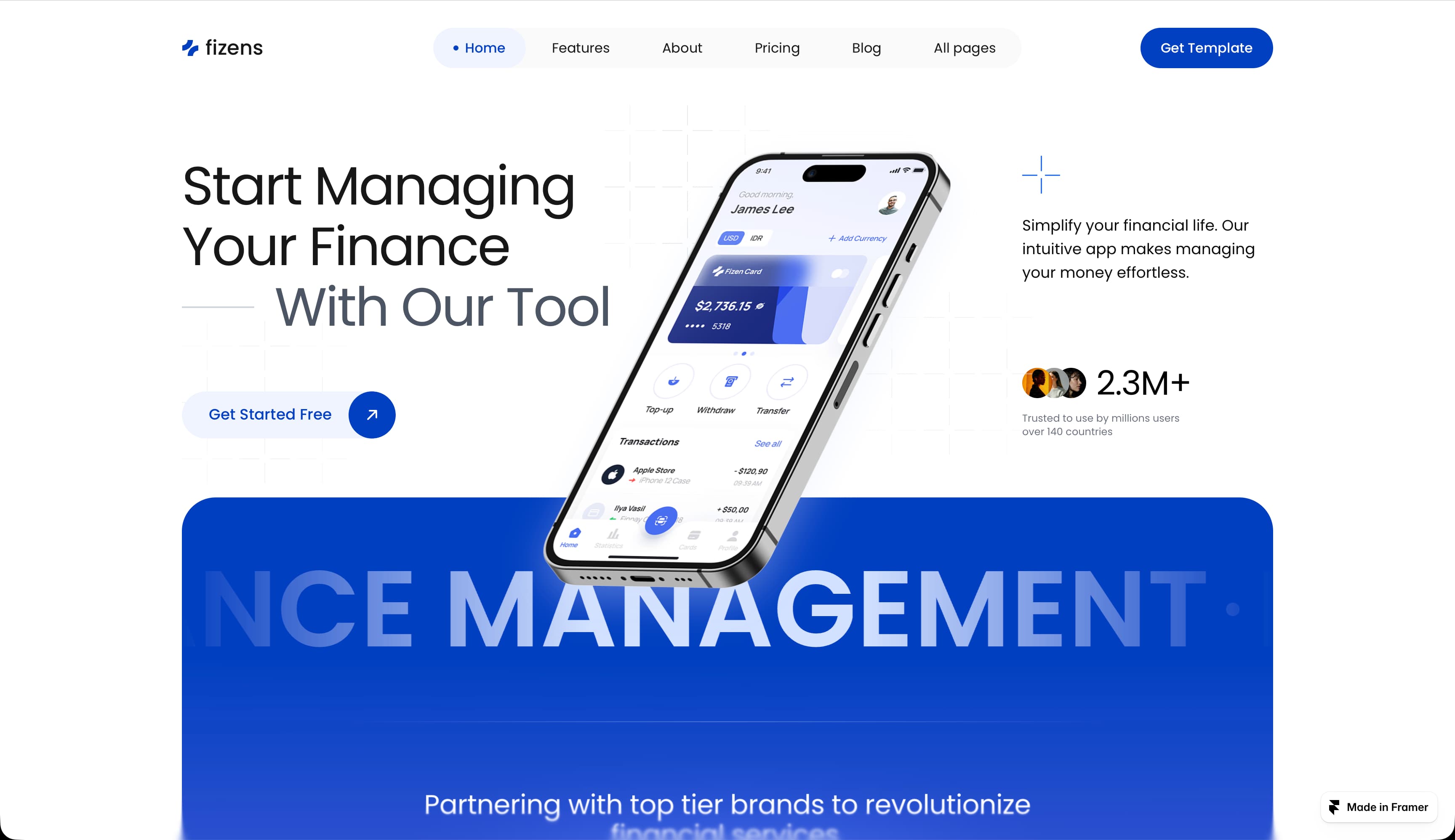Three different shades of blue each do their part to make this color palette feel complete and dimensional. The color of balance, blue, is a smart choice for a financial brand, like shown in this example of a Framer’s Fizens template, and works well contrasted with a white background and simple black typography.