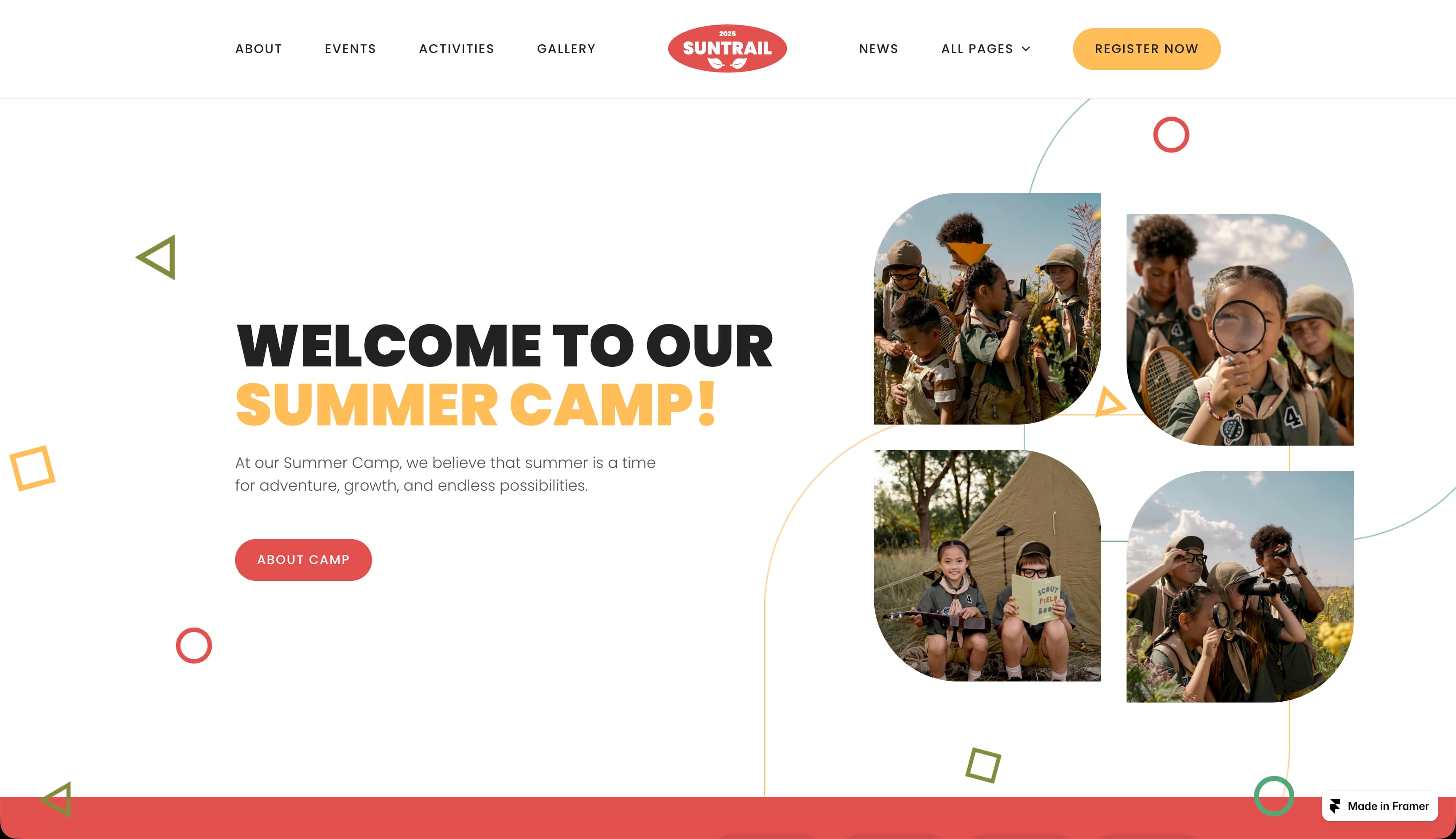 This split complementary palette, used in Framer’s Suntrail template, recalls the childhood month of August: summer is still in full swing, but school with its requisite supply shopping is just around the corner. The yellow and pink feel plucked from a freshly sharpened pencil in a military-green pack leftover from summer scout camp. This combo works great for kids’ content, anything related to summer, or a project that’s nostalgic for simpler times.