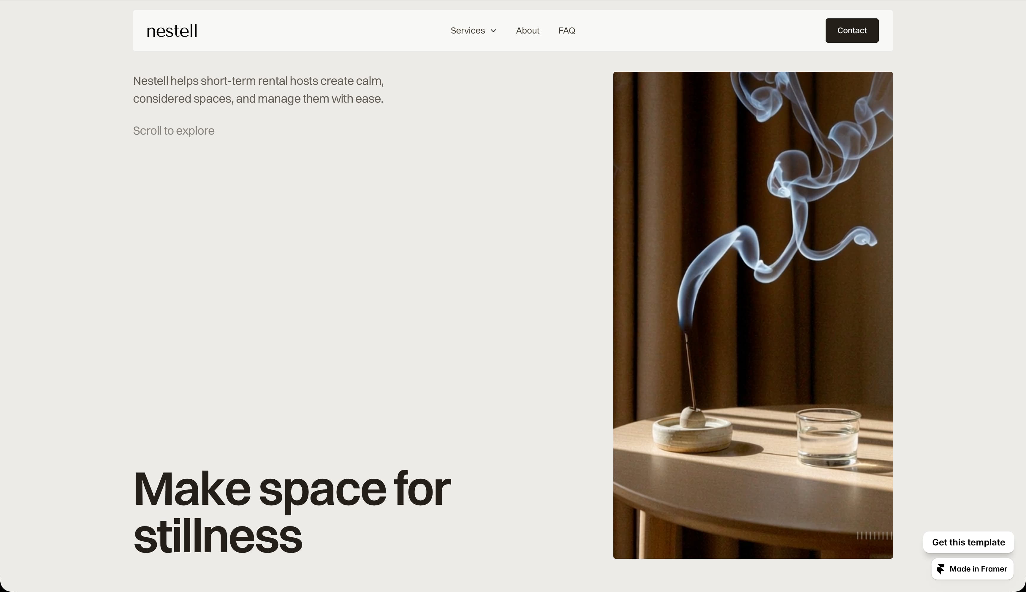 The fastest way to make your site feel ultra-minimal? Use background colors as your main colors. In Framer’s Nestell template, a rainbow of warm grays displays just how versatile gray really is. Shades with slightly different values, like the warm black and warm gray shown here, can feel elegant, subdued, and like a big exhale in an overstimulating world.