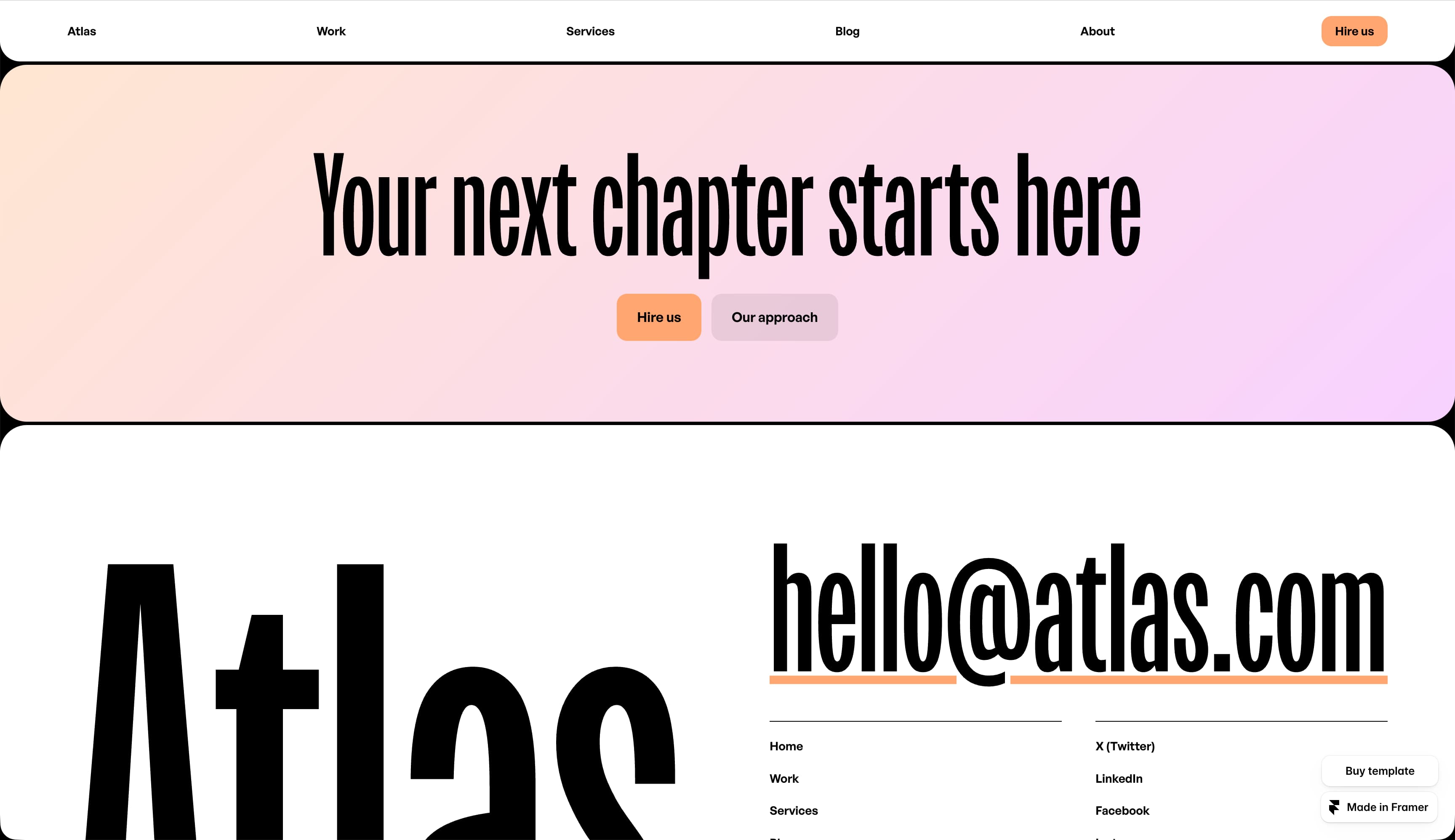 Four tetradic pastels combine to make a gradient that feels heavenly—or at least like a swirl of cotton candy on a summer day in Framer’s Atlas Studio Template. This light and airy combo is ideal for an agency’s portfolio, dropping to the background to display current projects while still adding a steady drumbeat of personality on every page. Worth noting: It wouldn’t work without the strong black typography as a counterpoint, and flooding the footer.