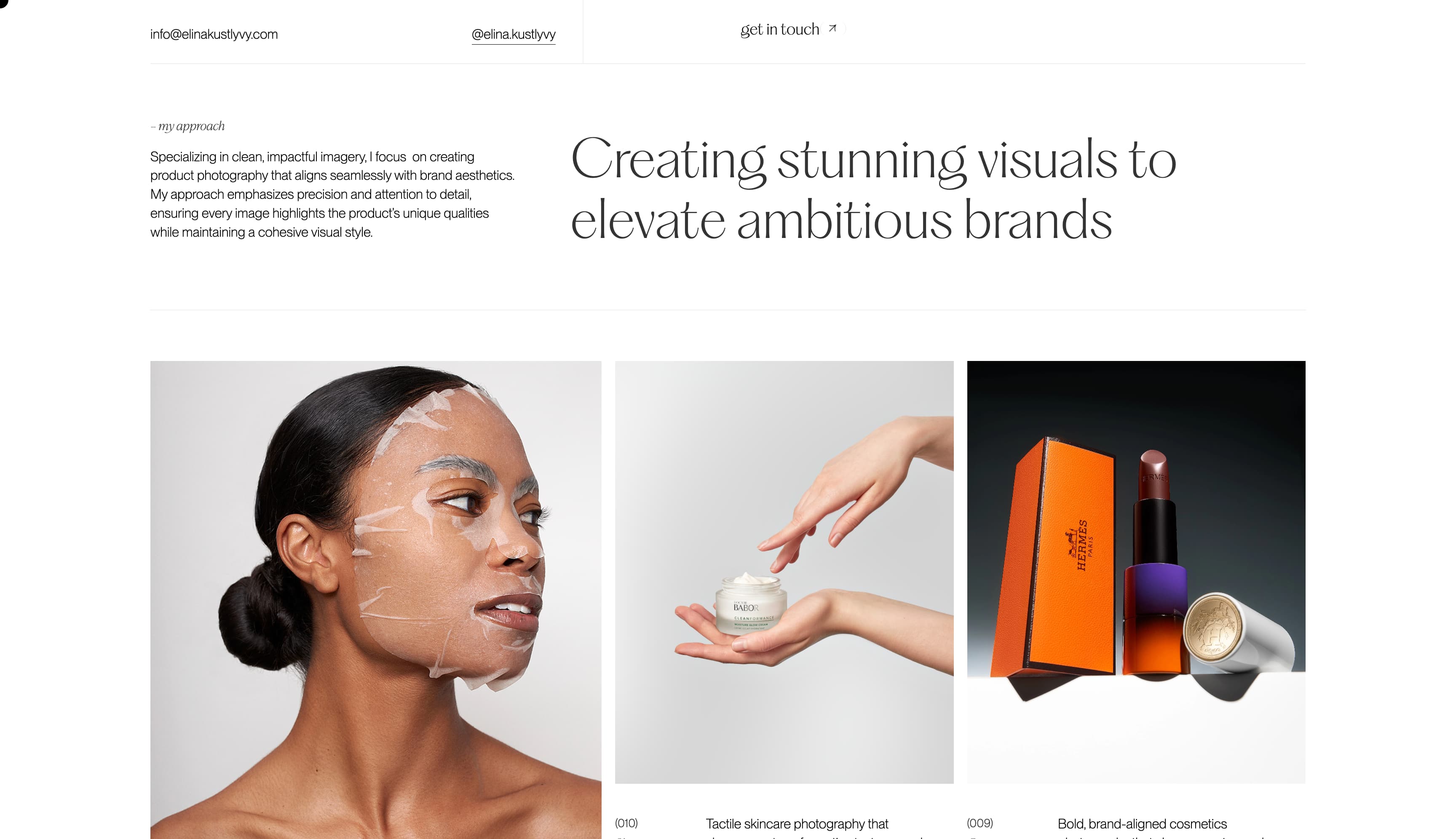 Eina Kustlyvy is a commercial product photographer based in Vancouver. Her portfolio pairs images with descriptions of her technique for more complex storytelling. A simple site design and white background keep the focus on the work. When a site visitor hovers over a photo, an animation is triggered that flips through multiple images from the same campaign or shoot.