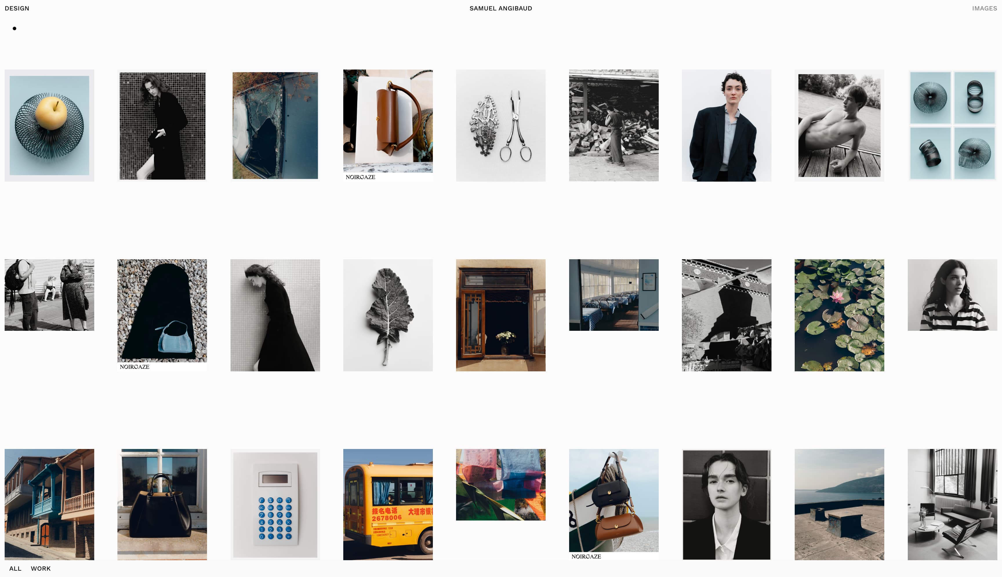 Split-screen layout. Angibaud’s simple homepage is organized with clear entry points to his two creative disciplines: design and photography.