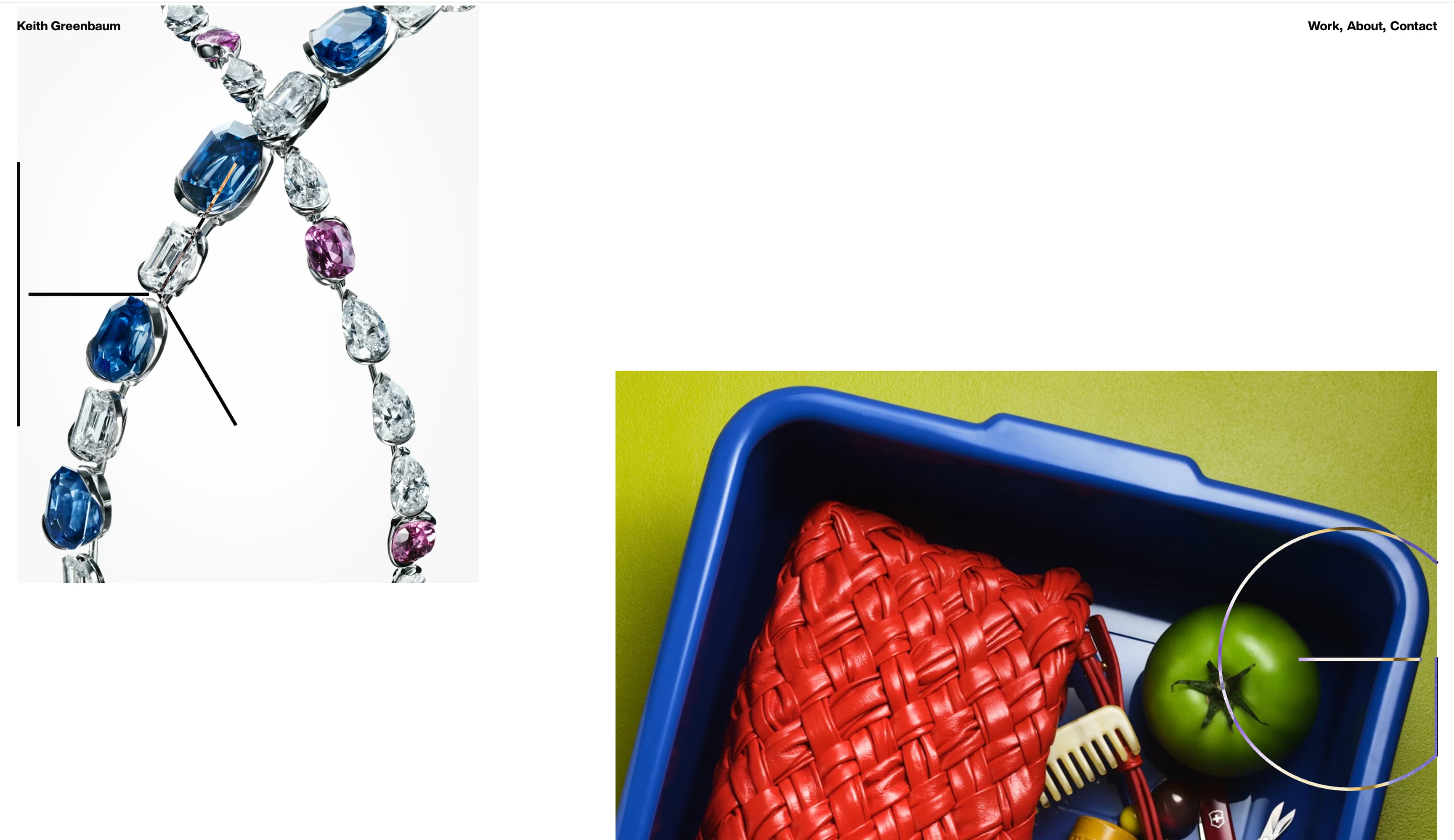 Manhattan photographer Keith Greenbaum specializes in still life and tabletop imagery. His portfolio employs subtle scroll effects to create an immersive browsing experience. On the homepage, scrolling pulls photos into view behind the split-screen logo, which also changes color as the images move. At the bottom of the page, a scroll-triggered footer turns lime green, adding an unexpected accent and inviting visitors to contact the photographer.