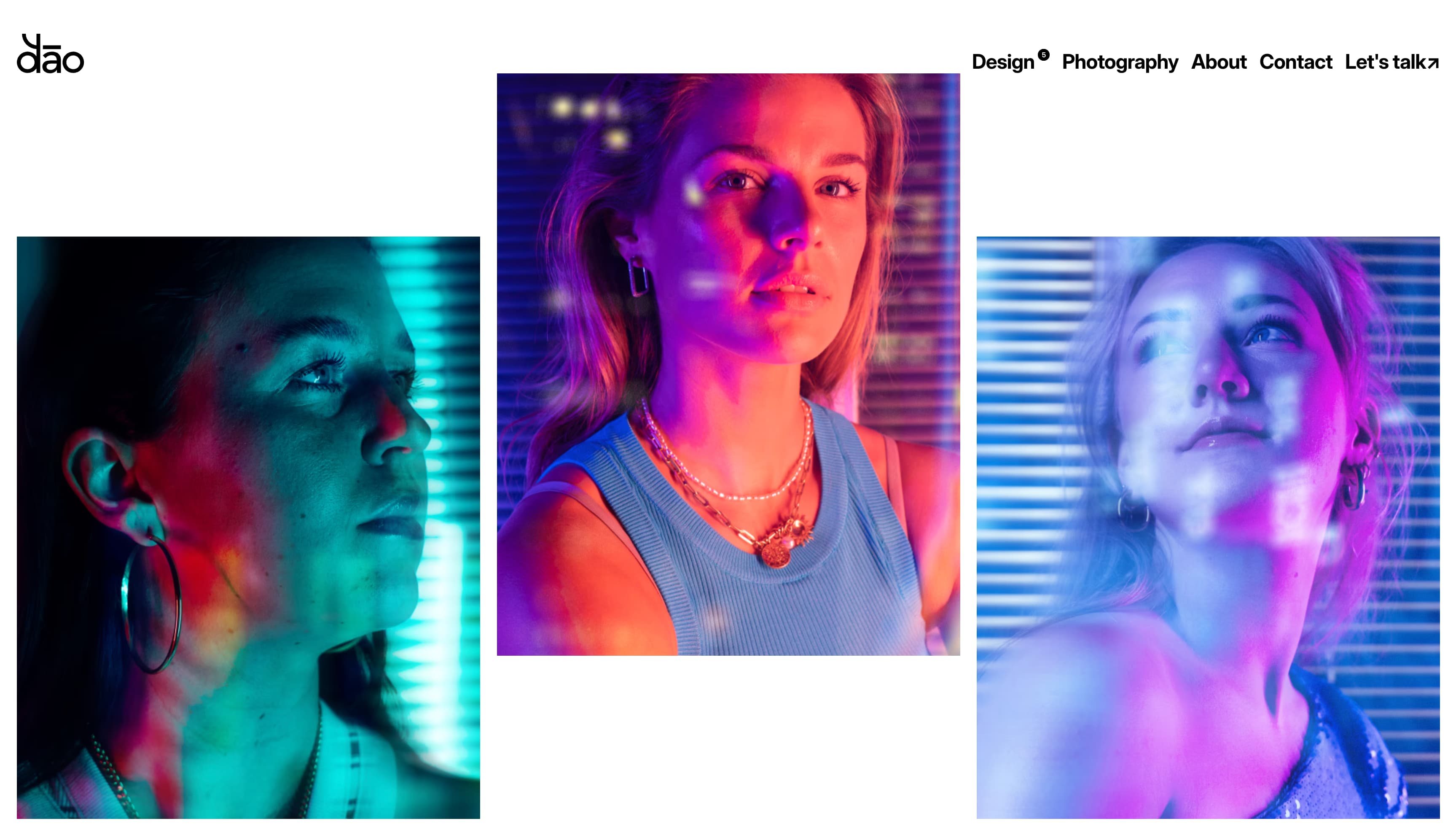 Responsive organization. Dao’s portfolio layout adapts to different screen sizes, transitioning between a staggered grid and straight columns, underlining Dao’s penchant for functional design.