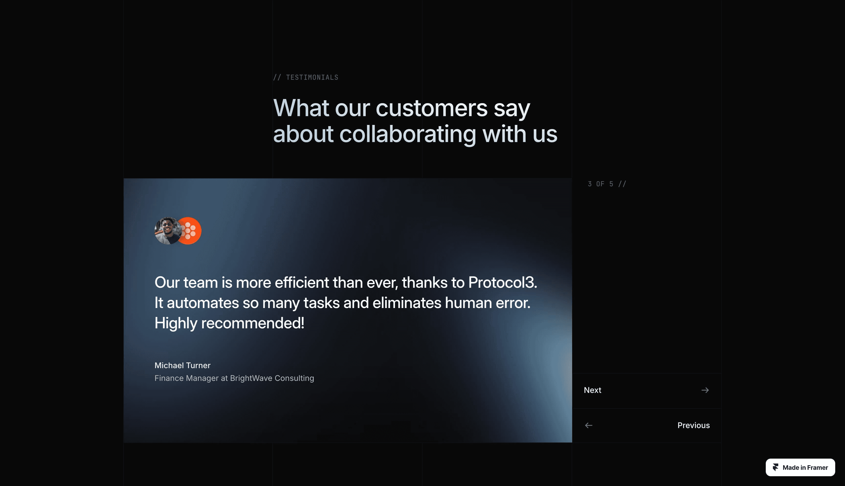 Framer’s Protocol3 template’s testimonial block puts the emphasis on the customer quotes thanks to large text and a clean background. The speaker’s photo and company logo in the top left help humanize and validate the quote. The design is easy to scan and scroll, using a clear visual hierarchy that keeps the testimonial copy front and center.