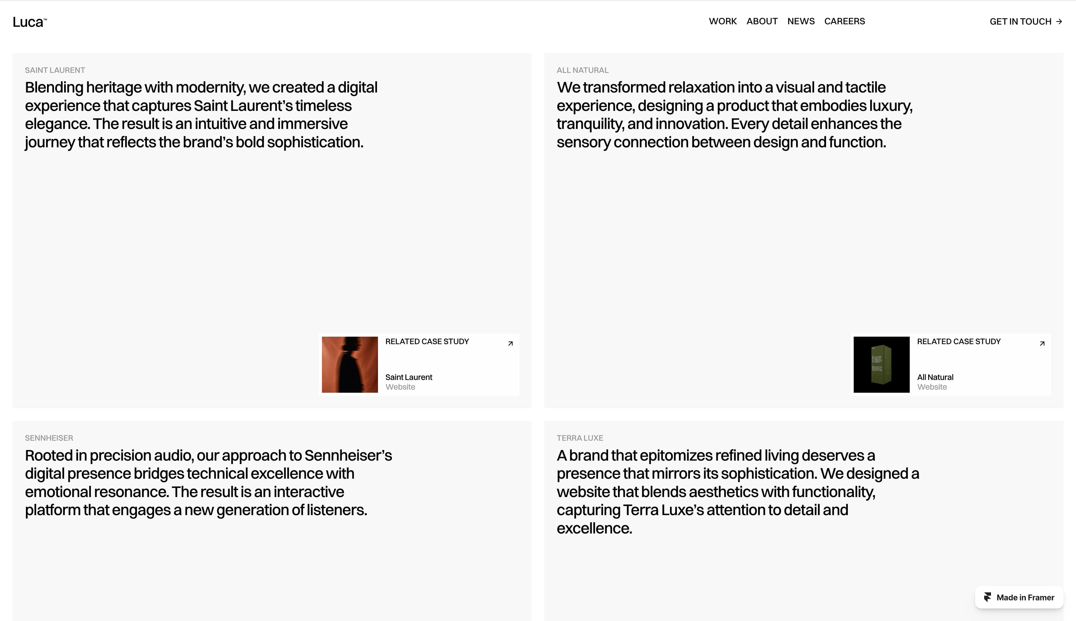 Framer’s Luca portfolio template includes a flexible section that can be used for work previews or testimonials. To implement as social proof, use the small text for the client company name, and present the testimonial quote in the larger text. Then you can link to the client’s case study from within the block.