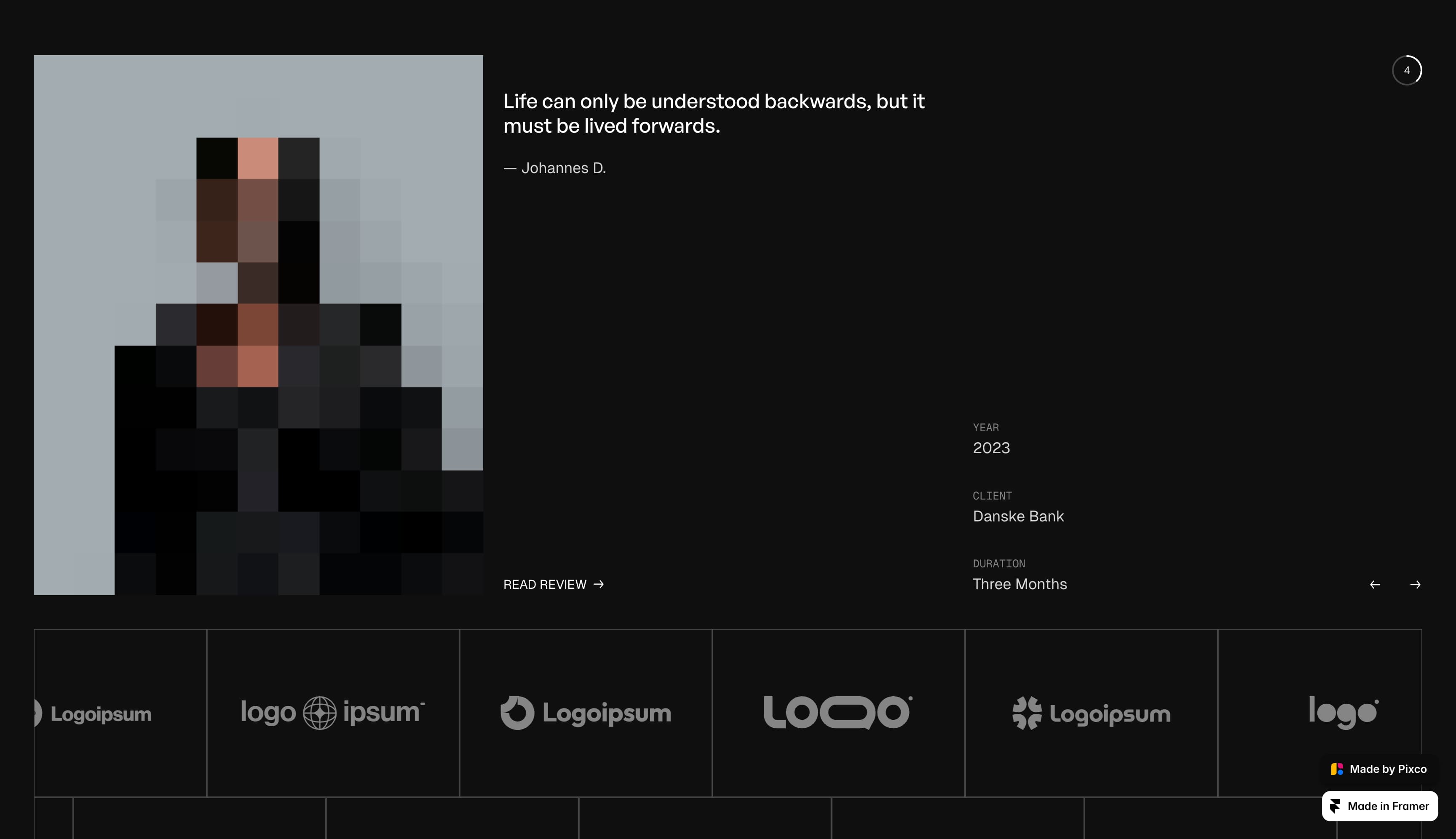 Framer’s Kierkegaard template allows agencies and freelancers to pair testimonial quotes with project information and a representative image. The template design pixelates the image until visitors hover over it. Each testimonial includes project year, contract duration, and client name, with an opportunity to link to a detailed case study. (You’d simply change the “Read Review” dummy text to “Read Case Study.”) Below, a scrolling row of greyscale client logos provides additional social proof.