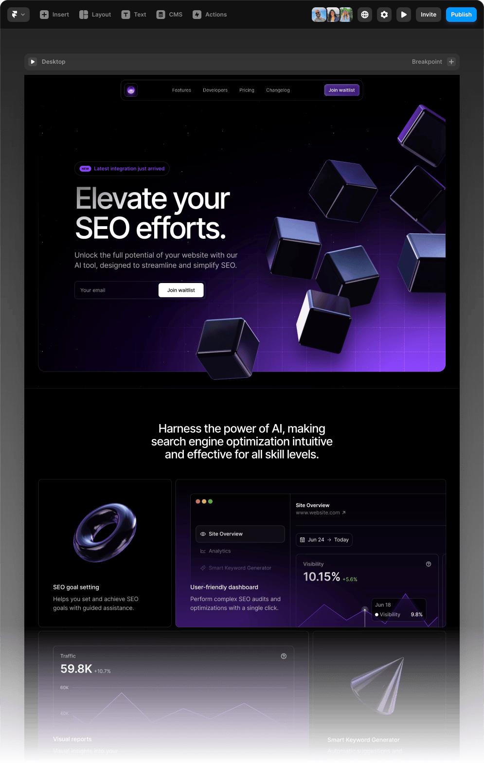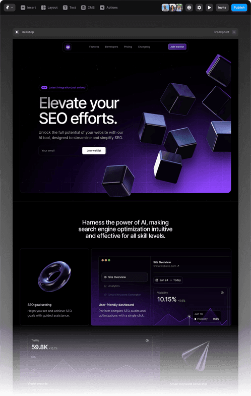 Combine, customize, and publish. Save time by choosing from sections, components, and visual elements. Easily mix and match, adjust layouts, add effects and interactions, and publish your site to a free Framer domain.